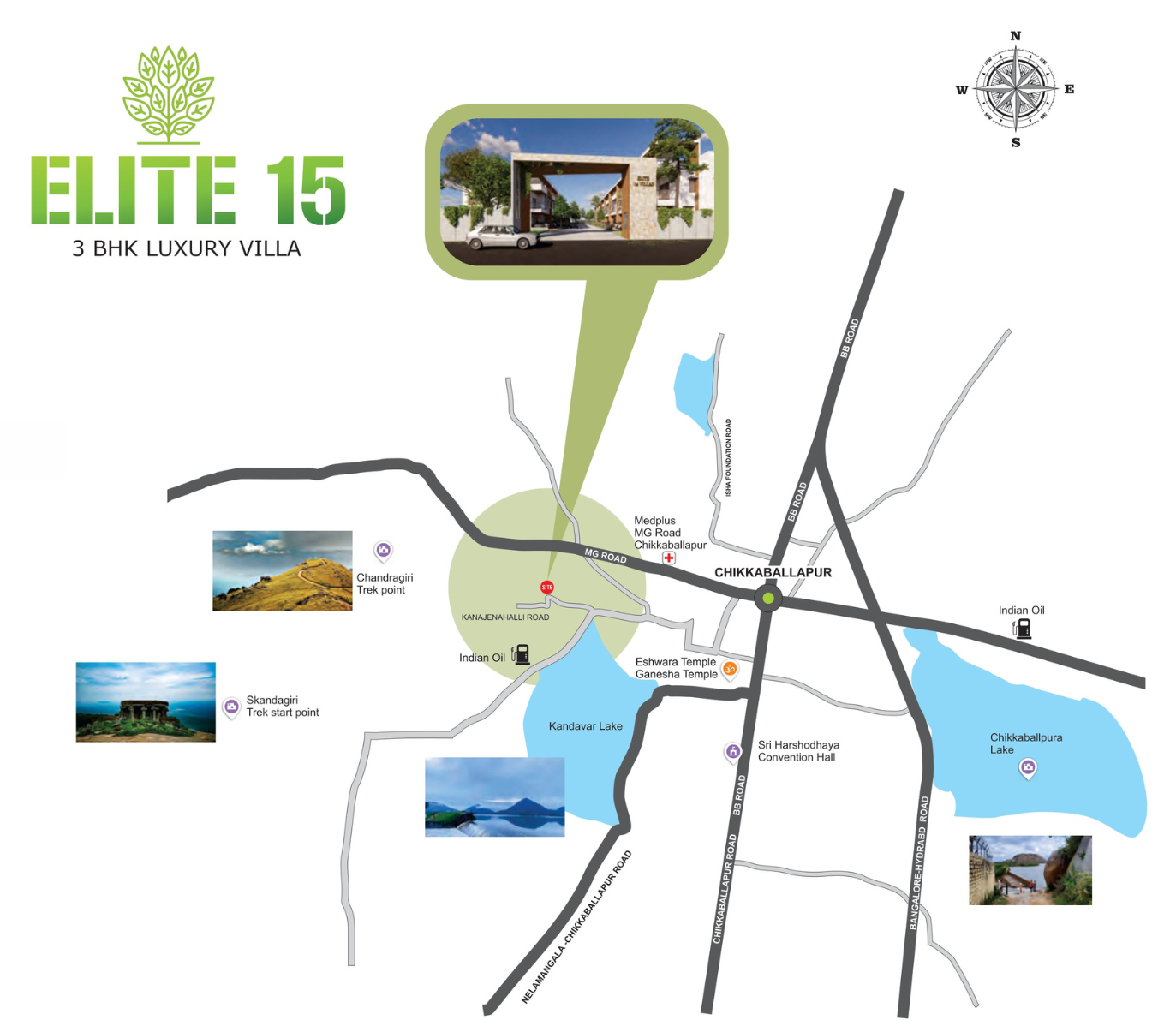 The project is located at Sy No. 50/12, Kalavara Village, Muddenahalli, Chikkaballapur District, Karnataka – 562101, near popular landmarks like Skandagiri Trek Point, Sathya Sai Hospital, and Nandi Hills.